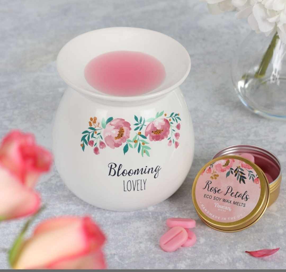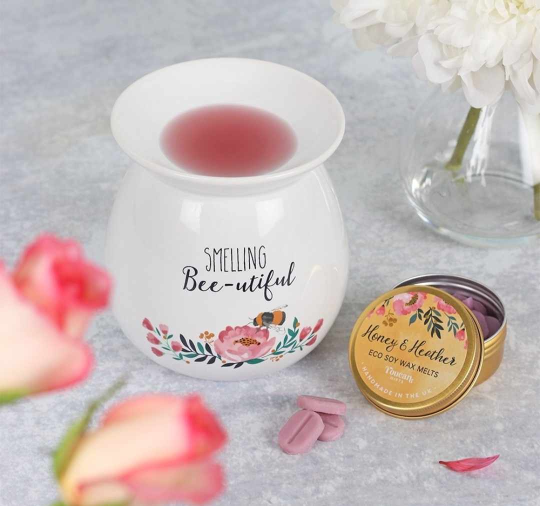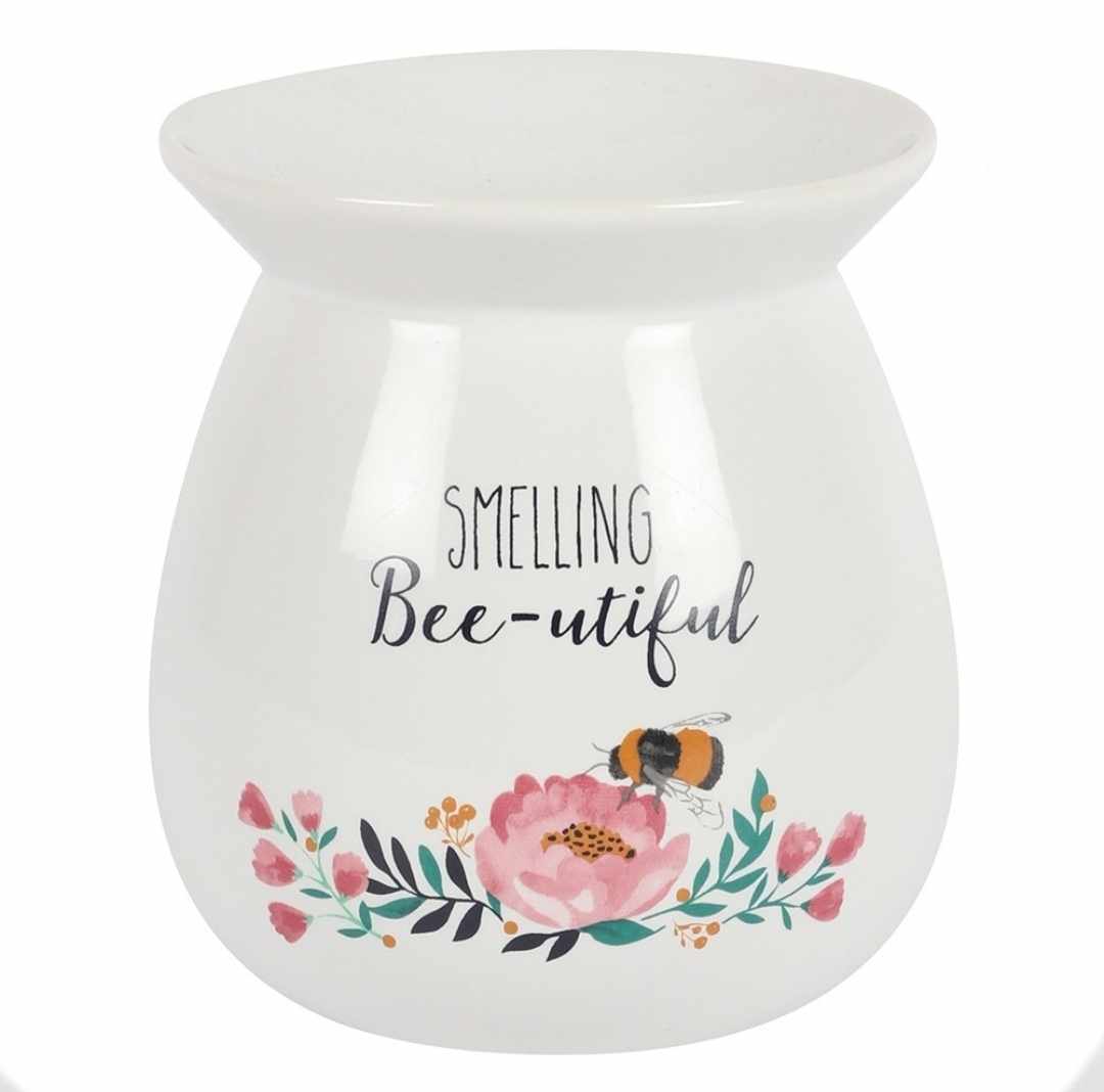 Introducing our latest addition to our home fragrance collection - the Printed Burner. This stunning piece is the perfect gift for anyone looking to add a touch of elegance and aroma to their home. Made from high-quality white ceramic, this burner features a beautiful floral design with the words 'Smelling Bee-utiful' or 'Blooming Lovely' printed on it.