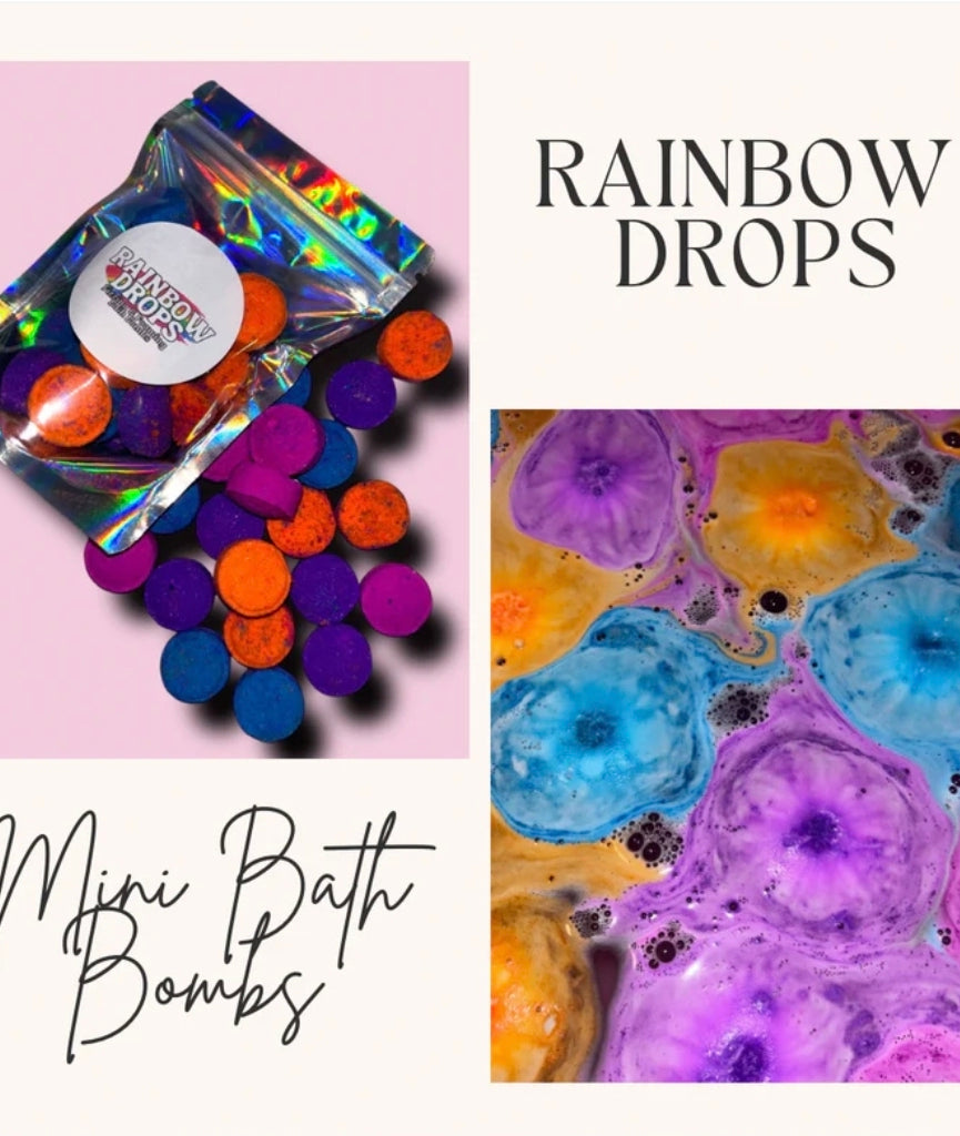 Add a burst of colour and fun to your bath with Rainbow Drops, the mini bath bombs that will make your tub a magical oasis (without any unicorns). Experience the benefits of a relaxing and colourful bath with these playful and quirky drops. Warning: may cause excessive singing and dancing in the tub! These mini bath bombs come in a bag of approximately 20, perfect for multiple uses if wanted. Transform your bath time into a colourful and enjoyable experience with Rainbow Drops Mini Bath Bombs.